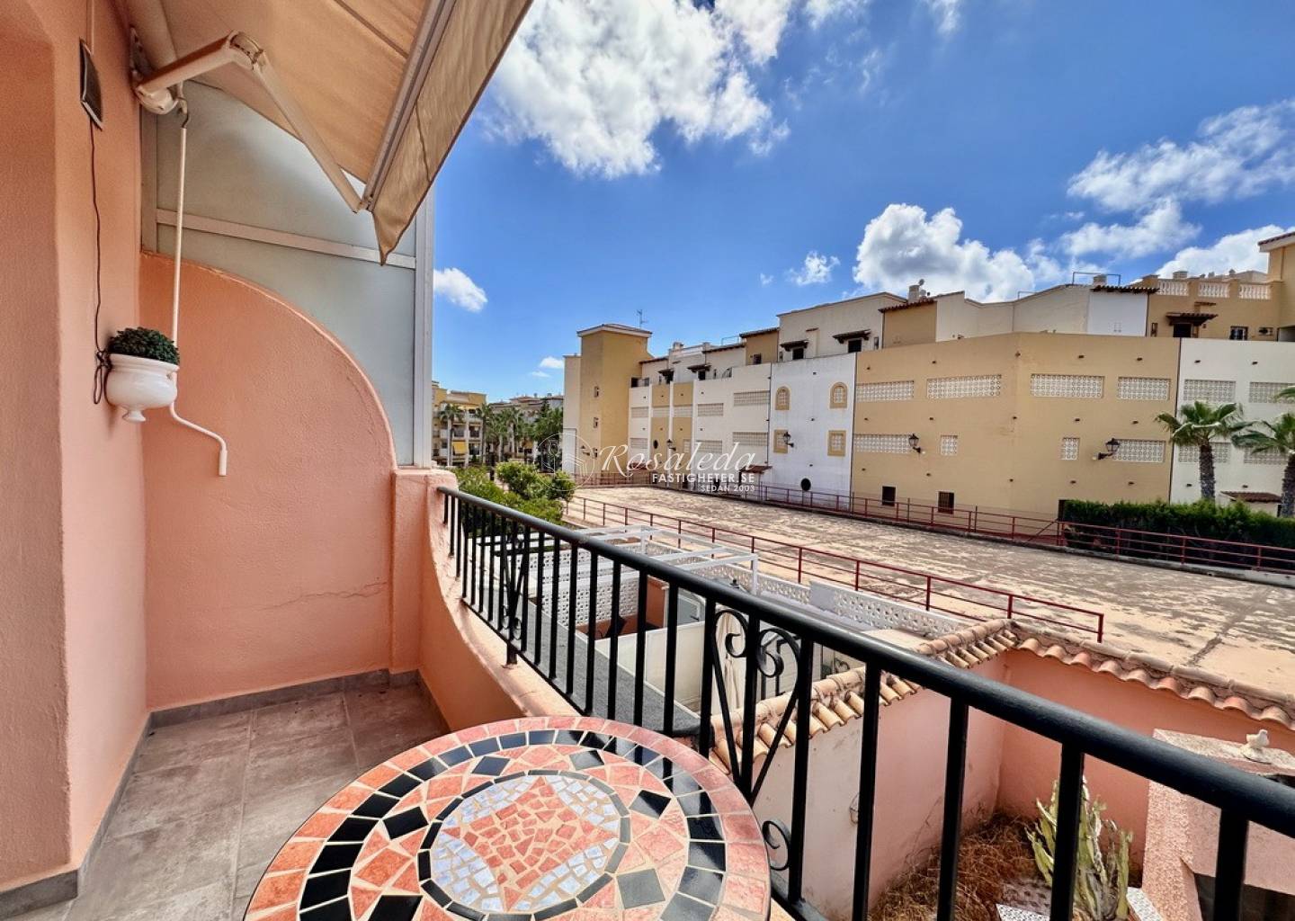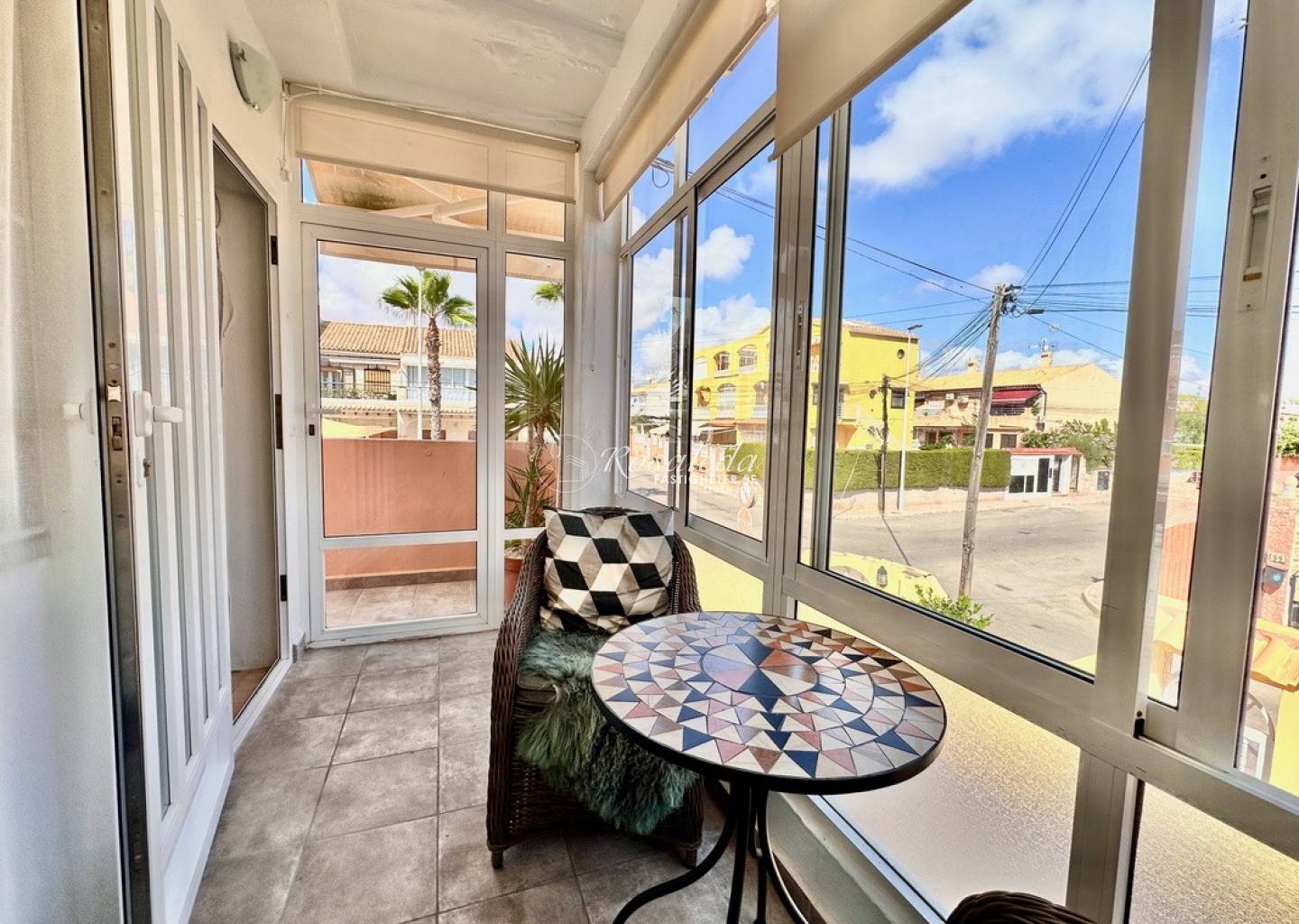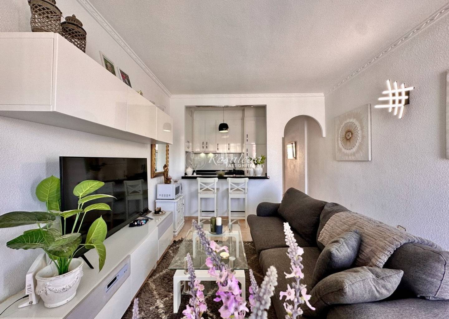 Here you will find a cozy apartment on the first floor with two balconies. When you enter from the stairs, you will come to the glassed in balcony on the north side of the house. Here, in the cool shade you will enjoy the breeze from the sea during the cooler half of the year and during the summer months the infrared heater allows you to sit outside, but cosily "inside". You enter the living room through the Spanish wooden door to come to the newly renovated kitchen. Furthermore, you have the bathroom with shower and washing machine and then you come to the bright bedroom with direct access to the balcony that is located in a purely south-facing position. Here there is nothing that disturbs the sun's path, and you really have it all day until it sets. This little gem is the perfect, safe and practical place for those of you who mainly wants to enjoy Spain during the winter months.