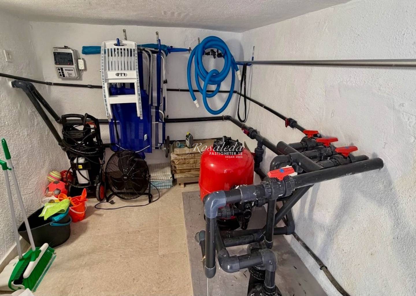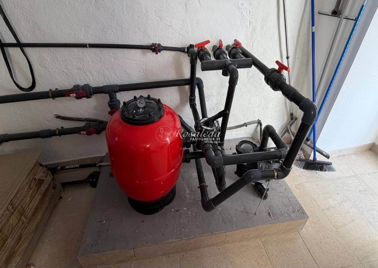 A large, brand-new heated pool surrounded by a spacious, sun-drenched tiled patio—ideal for year-round swimming and Mediterranean lounging.