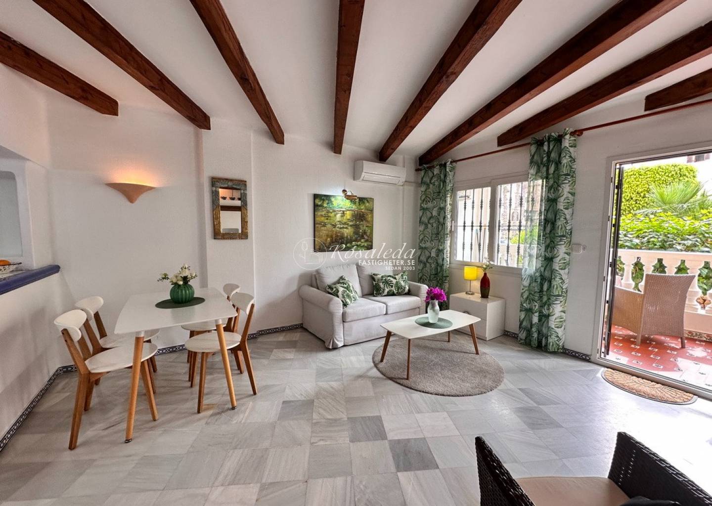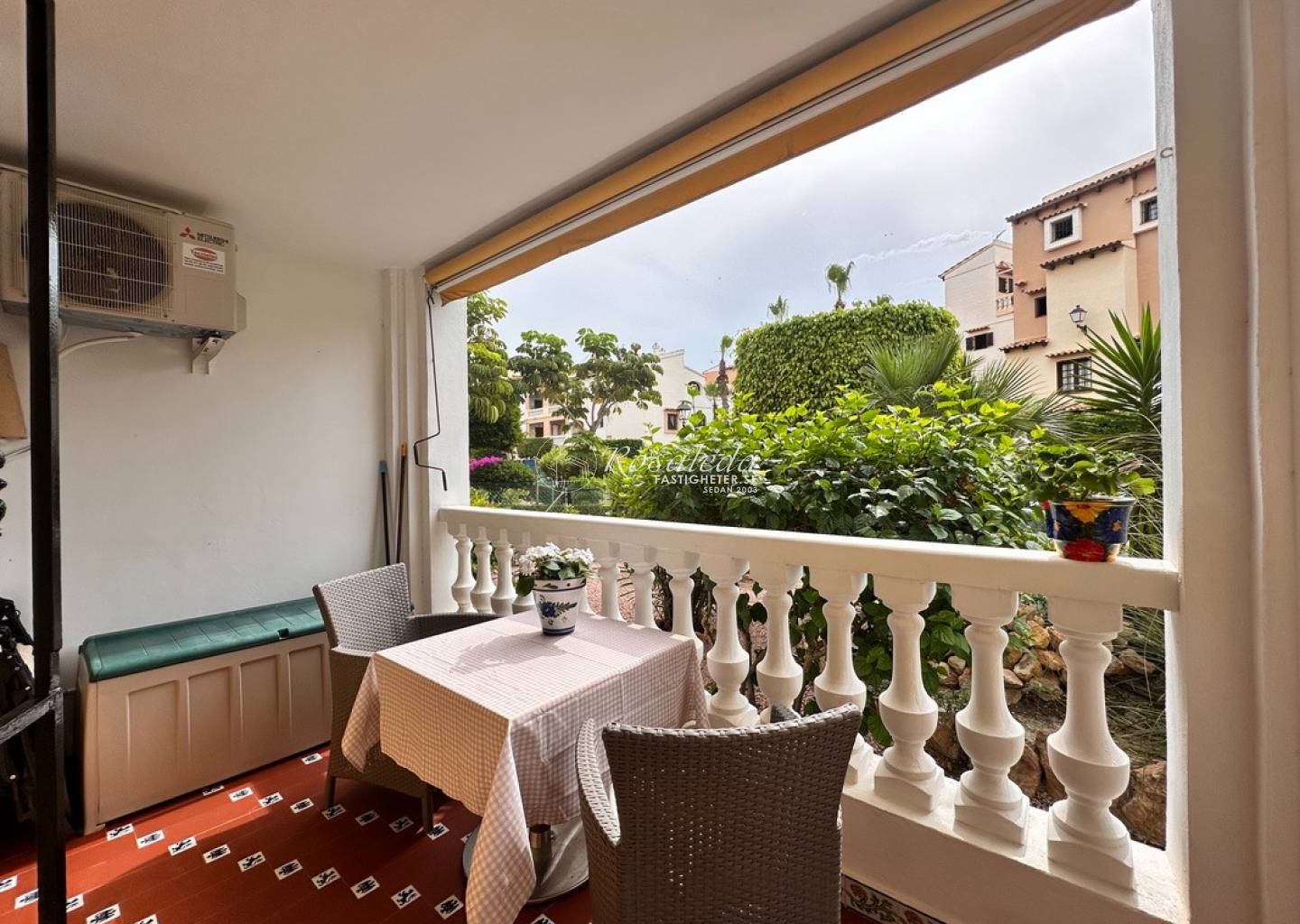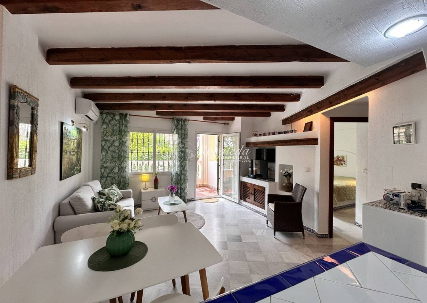 Lägenheten erbjuder 2 sovrum, 1 badrum samt ett ljust och luftigt vardagsrum med direktaccess till den generösa balkongen i öst/väst-läge – perfekt för frukost i solen eller skön kvällsbris. Bostaden säljs delvis möblerad och är utrustad med luftkonditionering, vitvaror, och inbyggda garderober.
